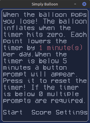 The Balloon inflates shortly at the start of the game to begin. The Balloon begins to inflate again once the timer hits 0. If the timer is not reset in time the balloon will pop. While the timer is below 5 minutes you can input a prompted "key" shown above the count down. If the count down is zero or below there are more prompts before the count down is reset. The game will give you "Subs" on occasion at a random rate and each sub reduces your time by 1 minute (per day).